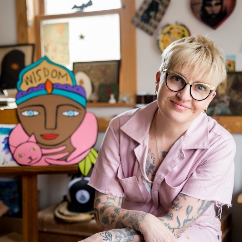 Known for a distinctive illustrative style inspired by iconography and folk art, Putney Koenig’s public art pieces incorporate vibrant colors and positive messaging. Her more intimate artworks explore the natural world and the mystical unknown. Putney Koenig has presented solo exhibits and organized group exhibits themed around the duality of life and death, addiction and recovery, self-doubt and self-love.